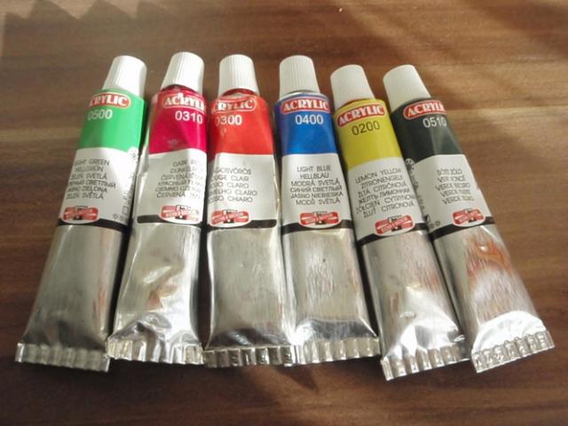 Įvairiu spalvų akriliniai dažai. Keičiu po vieną arba kelis