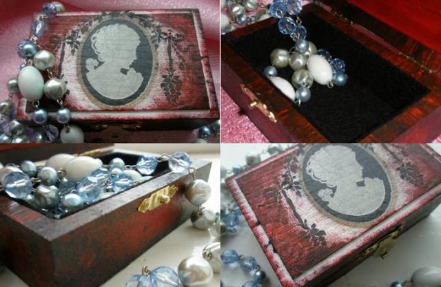 Pati su meile gaminau dekupažo technika. Dėžutė nenaudojama gulėjo lentynėlėje, nes gaminau pardavimui. Vidus apminkštintas netikru veltiniu. Matmenys : 10.5 x 7 x 4,5
