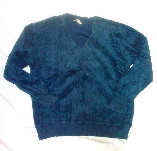 Tamsiai mėlynas aksominis džemperis.