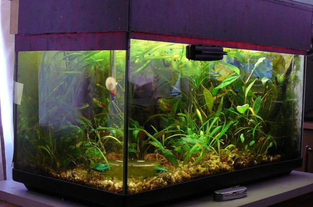 50L akvariumas komplekte daug augalu, krevetes red sherry, padas, savadarbis plastikinis apsvietimo dangtis aptrauktas klijuojama plevele, ekonomiska lempa, filtras aquael su aeracija (burbuliukais) ir su padidinta kempine, termometras.