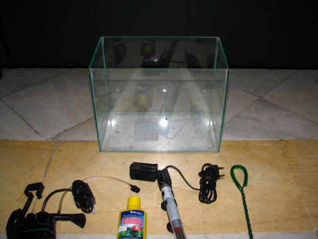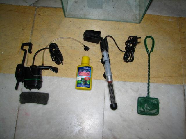 15 litrų akvariumas. Vandens filtras su visais aksesuarais, veikiantis. Vandens šildytuvas geras veikiantis. Magnetai stiklų gramdymui. Sietelis. Vandens cheminio balanso chemija ruošti vandeniui iš vandentiekio.