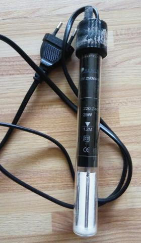 Naudotas (kaip matosi ir išnuotraukos), seniai spintelėje gulintis, bet veikiantis akvariumo šildytuvas 25w. Kiek litrų max tinka nepamenu, naudojau 30L akvai.