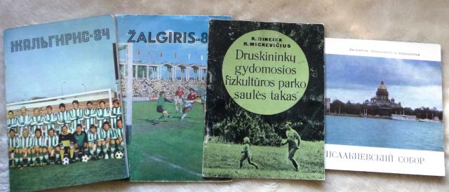 3 Книжонки-брошуры:1)Програма чемпионата СССЗ по футболу,на зусском языке 2)Žalgiris-85, apie futbolą 1985 v. 3)Dineika K., Mickevi2ius R."Druskinikų gydomosios fizkultūrods parko"saulės takas" 1975 m., minkšti virš., 30 psl.