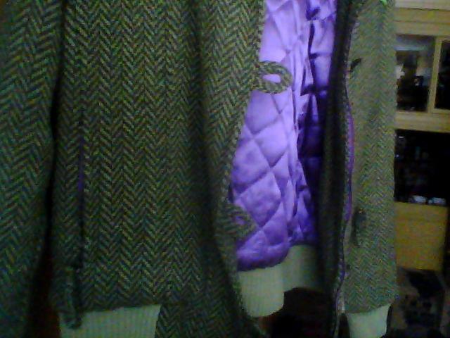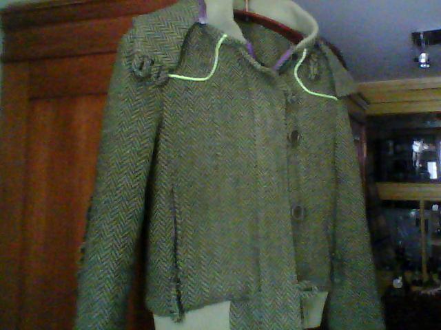 Originalus storos tvido tipo medžiagos striukė-paltukas su nusegamu gobtuvu. Dėvėtas sezoną, bet būklė labai gera, jokių defektų. Spalvos foto neadekvačios - realiai jis ryškiai samaninis su pilkšvais, o atlasinis daigstytas pamušalas - violetinis. Pašiltintas. Puoštas "fosforinėmis" (atšviečia šviesą) juostelėmis. Dydis S.