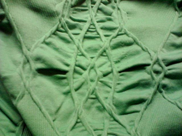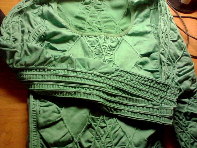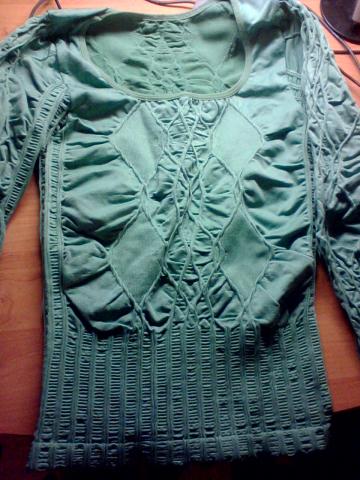 Žalia elastaninė ir raukta bliuskutė, yra pasipukojusi nugaroje neryškiai