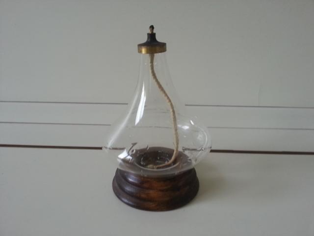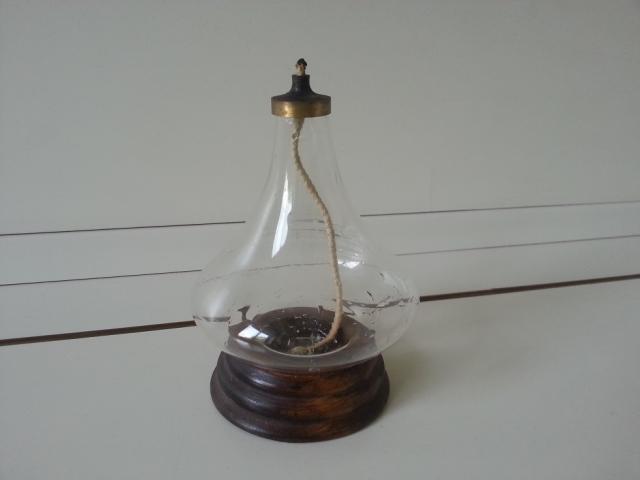 Aukštis - apie 12 cm. Į vidų pilamas lempinis aliejus. Dega knato galiukas, esantis viršuje. (c)