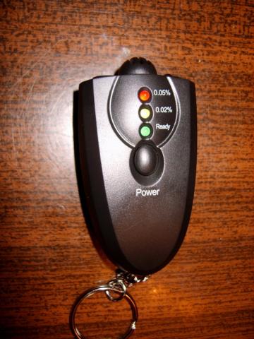 Greitas alkoholio matuoklis, nurodo žalia spalva- galima vairuoti, geltona 0.02 prom. ir raudona 0.05 prom. Dedasi du elementai AAA. Su pakabuku, galima prisikabinti prie raktelių. Taip pat yra žibintuvėlio funkcija.