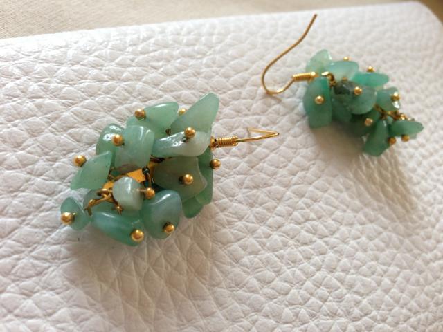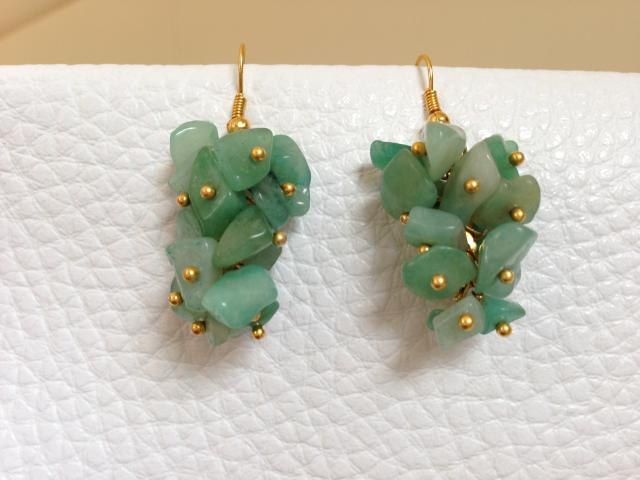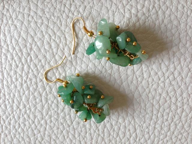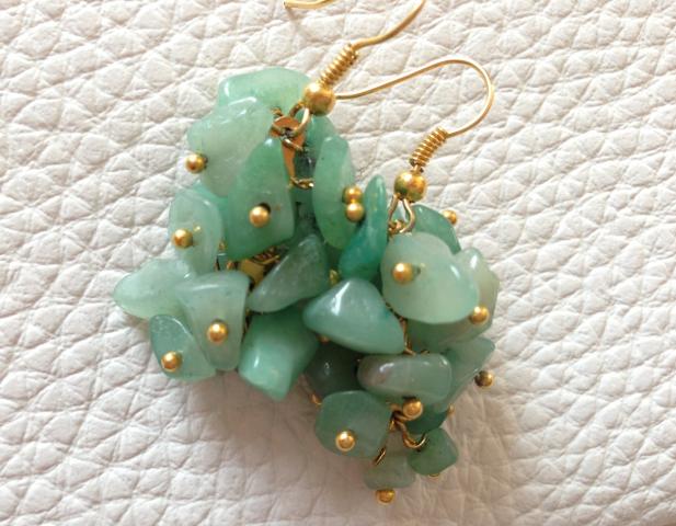 NAUJI *natūralus akmuo; *ilgis su įvėrimu: 42mm, diametras: ~20mm; *lengvi, dailūs auskariukai bet kokiai progai; *rankų darbo; Sudėtis: aukso spalvos metalų lydinys; natūralus žalsvas agatas;