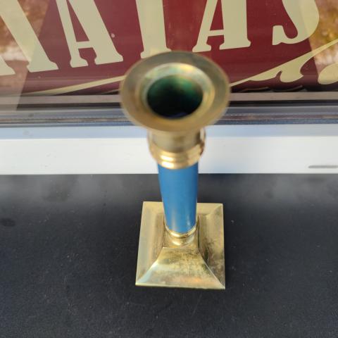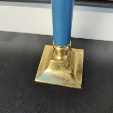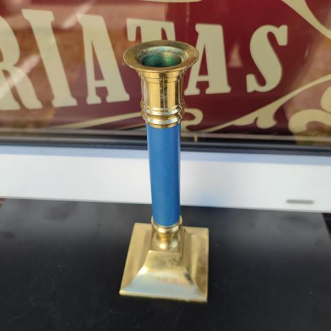 Žalvarinė vienos žvakės žvakidė su violetinė metalinė dalim.