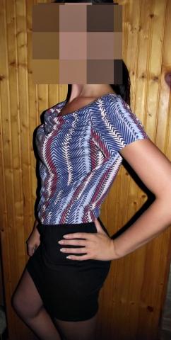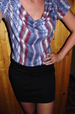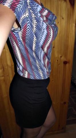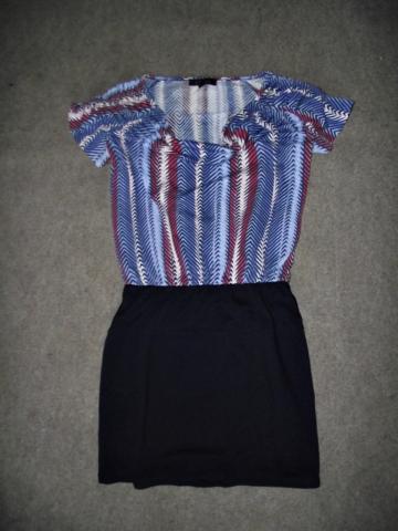 Nešiota tik kelis kartus, be defektų. Tik buvo trumpinta, nes buvo ilgoka, beveik iki kelių. Ilgis 88cm, mėlynos dalies (sijonuko) ilgis 40cm, ties klubais ~43, tačiau dar tempiasi daug. Ties ta vieta kur jungiasi marga medžiaga su vienspalve yra guma. nemainau