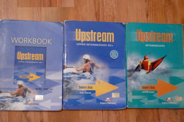 mėlynos: Upstream upper intermediate B2+ Workbook ir Student's Book Upstream Upper intermediate B2+ (knyga ir pratybos); žalia: Upstream intermediate Student's Book (tik knyga)