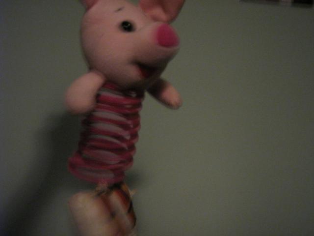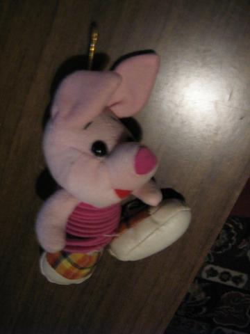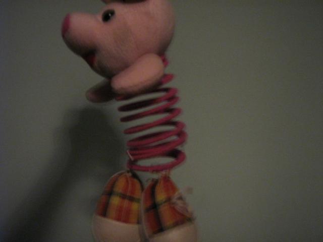 Mielas paršiukas su spyruoklė.Kojos jau kažkada buvo sutvirtintos savo siūlais,bet šeip gerai išsilaikęs dar~ūgis svyruoja nuo 21cm iki 85(labai ištempus)cm