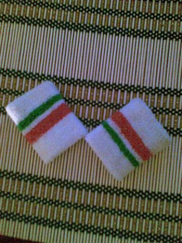 Du balti antriešiukai su raudonom ir žaliom drūžėm.