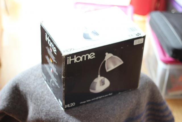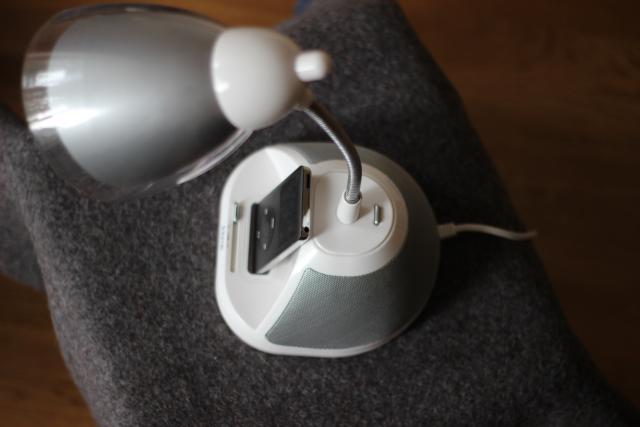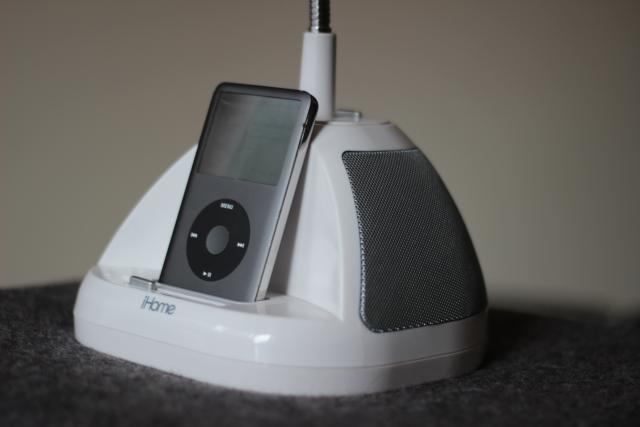 APPLE iHome lempa ir kolonele su bass funkcija. Galima reguliuoti garsa. Yra 3,5mm jungtis, tad galima pajungti bet koki kita prietaisa turinti ausiniu kistuka (mini-jack). Laidas yra komplektacijoje. Galima klausytis muzikos su ijungta arba isjungta lempa. Be sviesos, prietaisas naudoja tik 3W. Veikia visi iPod, iPod Shuffle, iPod nano ir iPhone modeliai. Galima naudoti kaip pakroveja, nes istacius iPhone telefona arba iPod grotuva, vyksta krovimas. Yra isukta kaitrine 25W lempute.