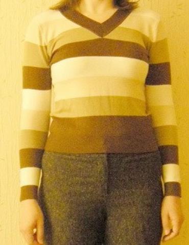 Krūtinės (pusės) apimtis 42 cm, ilgis 52 cm, rankovės ilgis nuo peties 55 cm. Sudėties nežinau, manyčiau vilna su elastanu (tamprus). Pasipūkavęs nuo nešiojimo. Apykaklė V formos.