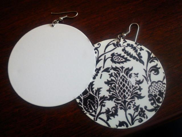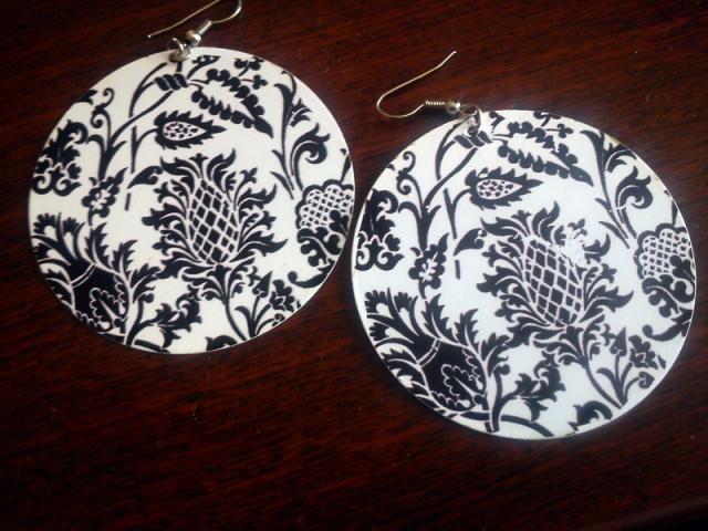 6cm skersmuo, labai gražūs. Viena pusė balta, o kita su juodais raštais (matosi foto). Išties labai puikūs, akį patraukiantys auskarai.