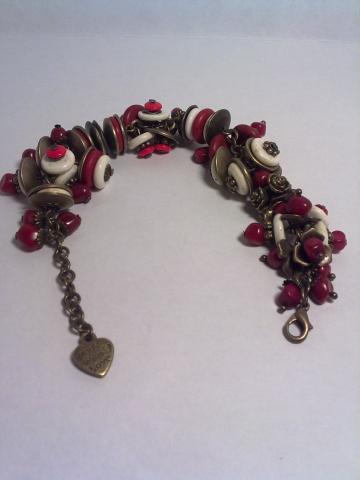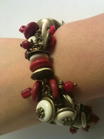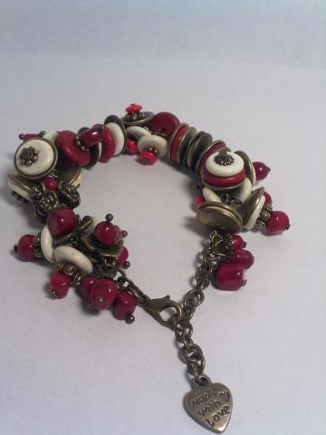 Universalaus dydžio apyrankė su koralais, magnezitu (sint), sendinto žalvario sp detalėmis.