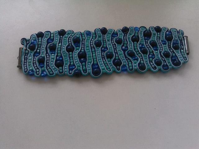 Rankų darbo apyrankė iš sutažo juostelės ir karoliukų
