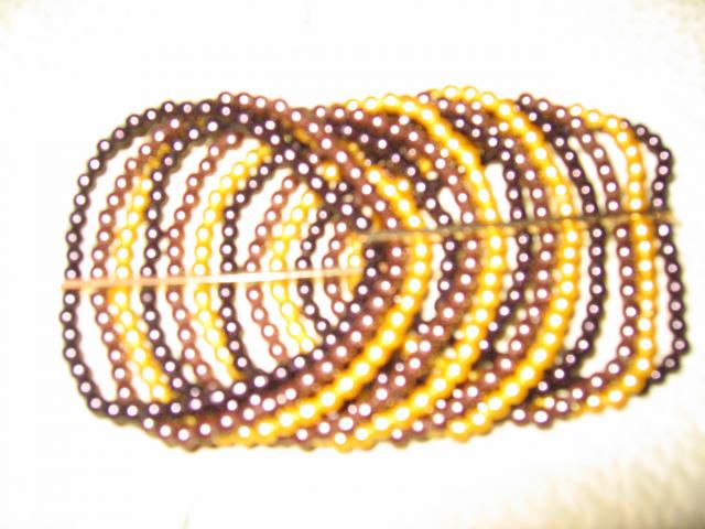 Smulkių rusvų karoliukų plati apyrankė, suverta ant gumyčių. Ant rankos atrodo prabangiai.