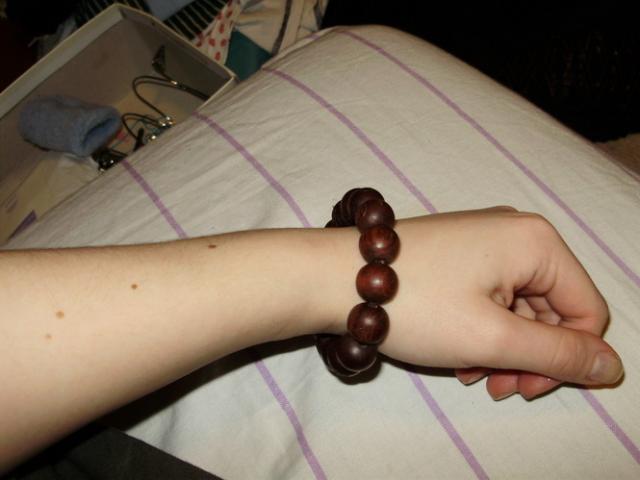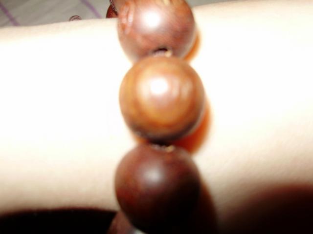 medinė, stambių karolių su hieroglifais ir budos atvaizdu.