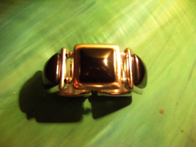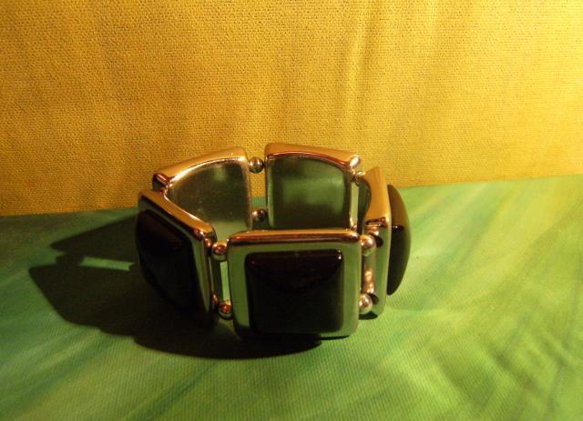 Plastmasinė apyrankė, tačiau atrogo lyg būtų metalinė. Kvadračiukai suverti ant gumos, taigi dydis universalus.