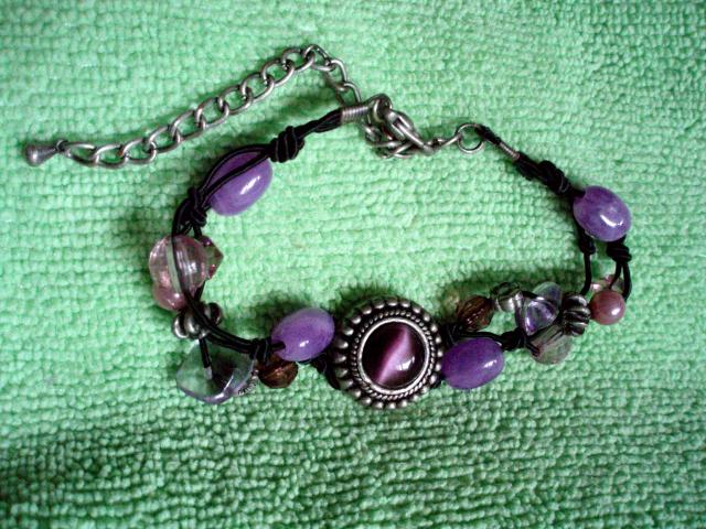 Violetinių atspalvių detalės suvertos ant juodos virvelės