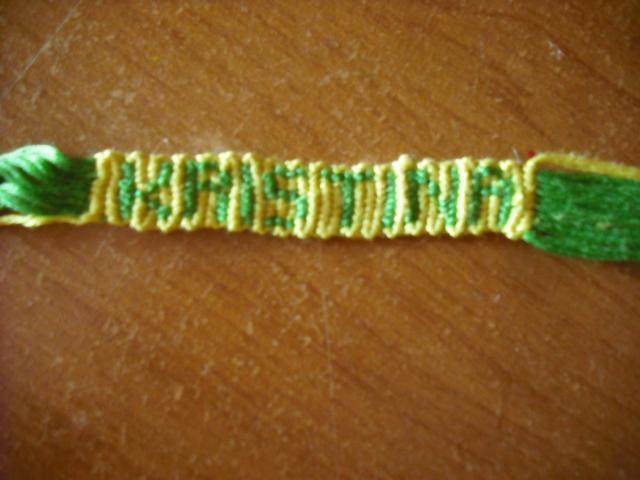 Pinta apyrankė iš siuvinėjimo siūlų, su vardu „Kristina“.