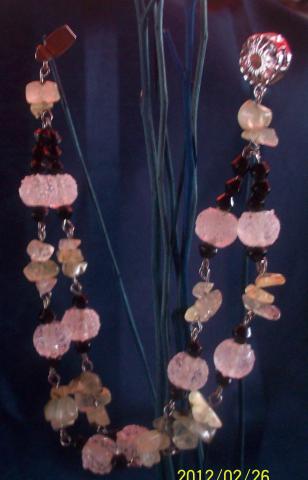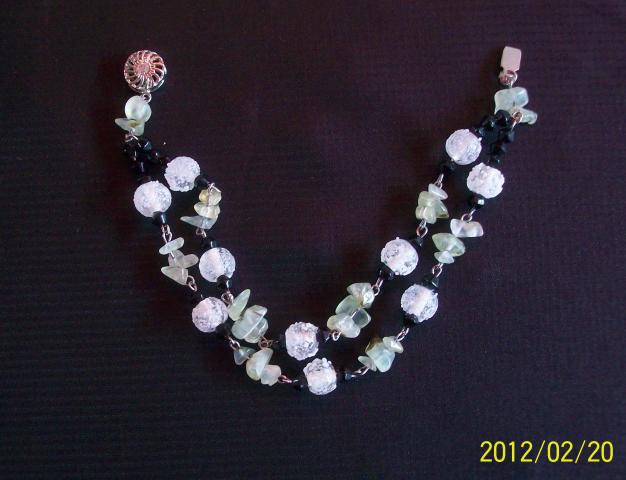 Apyranke, ilgis 18cm, zaliojo granato skalda, 4mm juodieji kristalai, 10mm indisko stiklo serksno karoliukai, metalizuotos detales, uzsegimas platinuotas su kristaline akute. Kaina 20lt