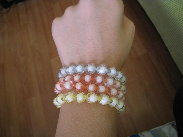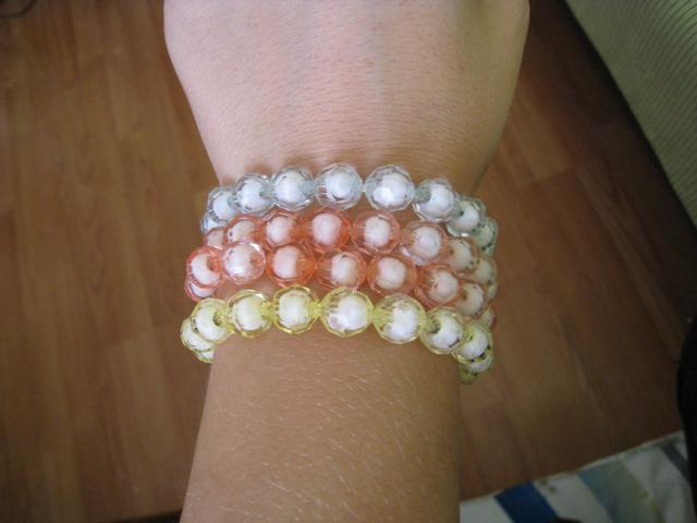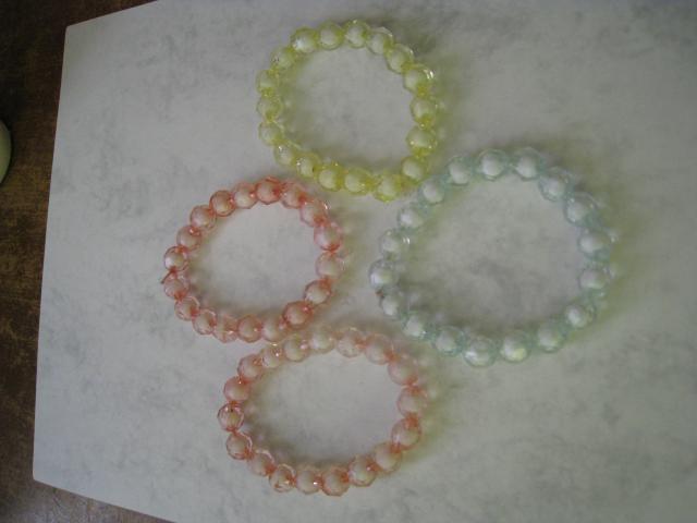 Spalvotos keturios apyrankės ant gumutės. Viena apyrankė 4lt. Yra viena rožinė padėvėta apyrankė. Ją parduodu už 2lt. Galima pirkti tiek kartu tiek ir atskirai