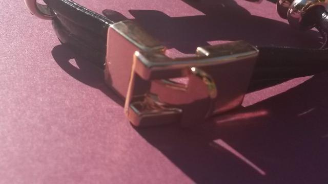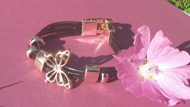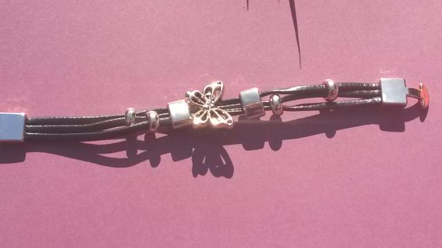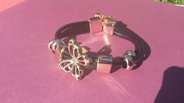 Daili juoda apyrankė su drugeliu bei kitais metaliniais papuošimais.Galimas siuntimas paštu.