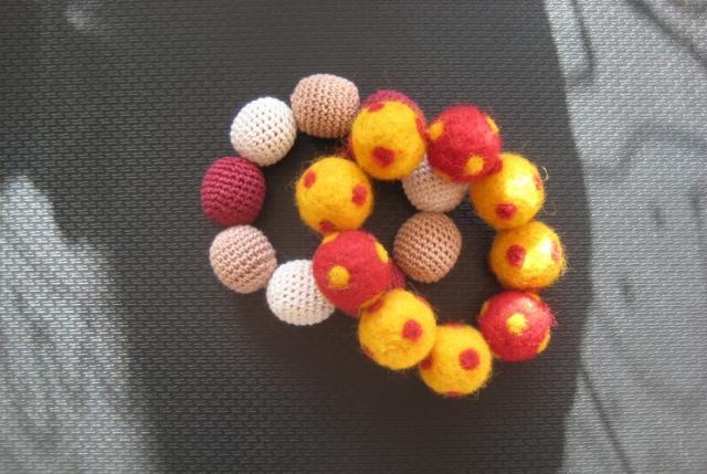 Gražios apyrankės. Abi rankų darbo. Velta apyrankė (su raudonais bei geltonais burbuliukais) nėra labai tampri.