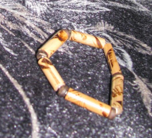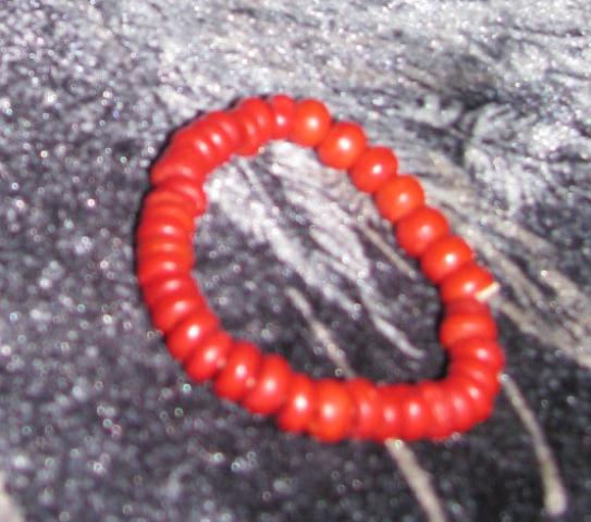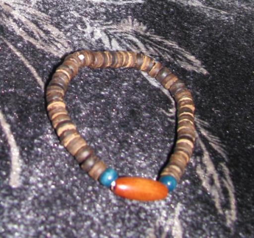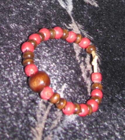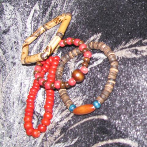 Medinės apyrankės, išskyrus viena (raudona) iš koralo karoliukų.(: