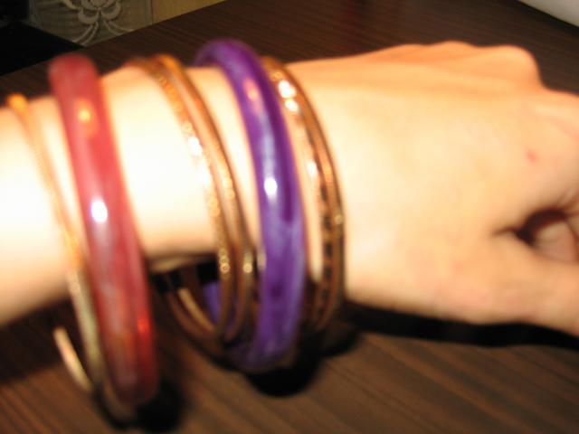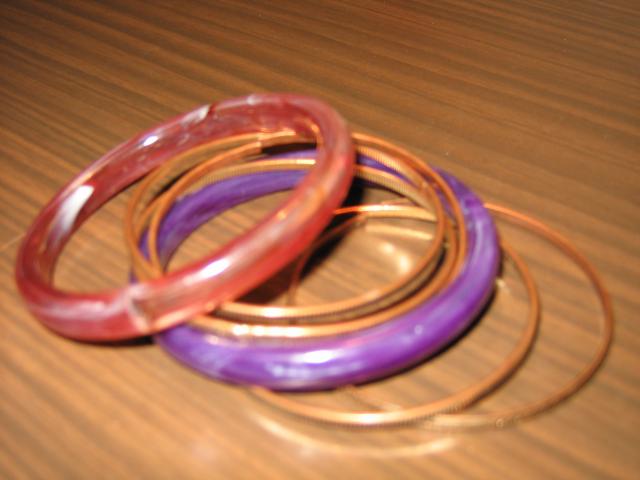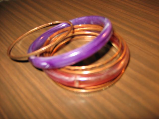 Apyrankių rinkinukas iš 7 apyrankių: 5 plonos metalinės ir 2 plastmasinės storesnės apyrankės, violetinės ir rudos spalvų.