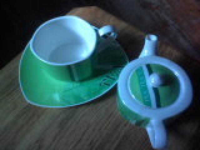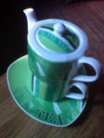 naujas, triju daliu: puodelis, lekstute ir arbatinukas, dedamas ant puodelio. Grazios zalios spalvos ir trikampes formos:)