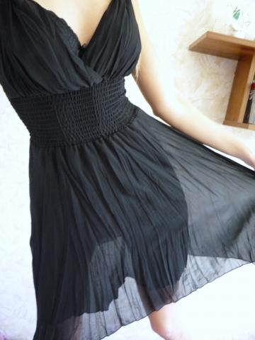Juoda, labai lengvos medžiagos suknelė su nutysusiais galais kitaip - simetriško kirpimo) dydis 38, tiks nuo XS iki mažo M. Praktiškai nauja. NEMAINAU