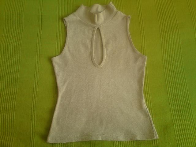 Graži palaidinė be rankovių, su kaklu ir iškirpte ant krūtinės. Gražios aukso spalvos, su blizgučiu. :)