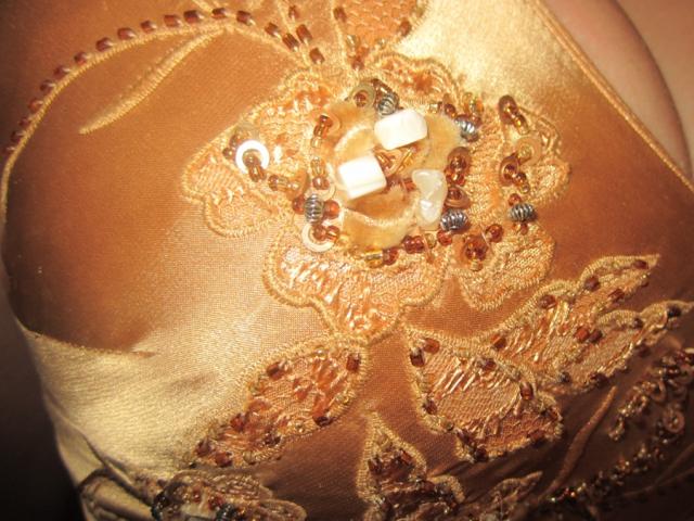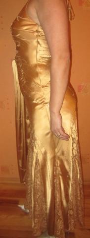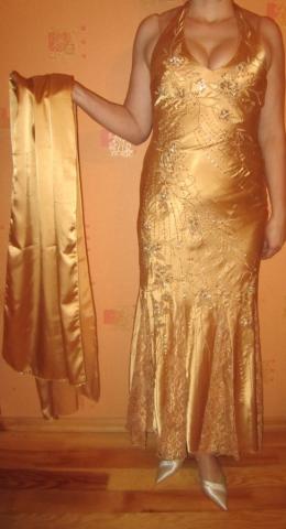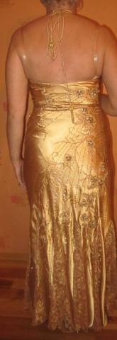 Auksinės spalvos balinė suknelė prie kurios priderinti šalis ir vyro kaklaraištis