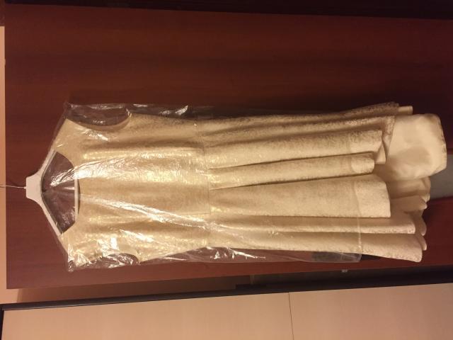 Labai grazi suknele. Prabangi medziaga, siuvineta aukso sijlemis-atrodo itin prasmatniai, tvirta medziaga. Yra mazas defektas - pradeginta cigarete maza skylute, taciau ja uzdengia sklastis-nematyti.