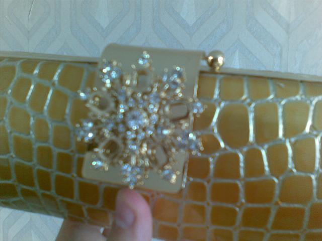 Nauja puiki delninukė, papuošimas snaigė, viduje du skyriai, per vidurį dar kišenėlė su užtrauktuku, o šone irgi yra kišenytė. Yra ilga prisegama grandinėlė tokios pat aukso spalvos, kad būtų galima rankinę neštis ant peties. Nuotraukoje, aišku, matosi mažiau, bet iš tikrųjų fantastiška delninukė! Džiaugsis ta, kuri ją turės :) Mainams 40 Lt