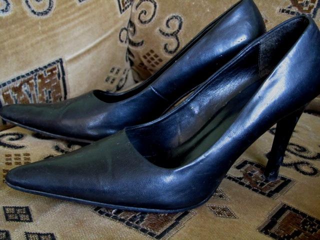 Juodi, aukštakulniai bateliai, smailiu priekiu, juodos spalvos, odiniai. Truputį dėmėti. Kainą siūlykite.