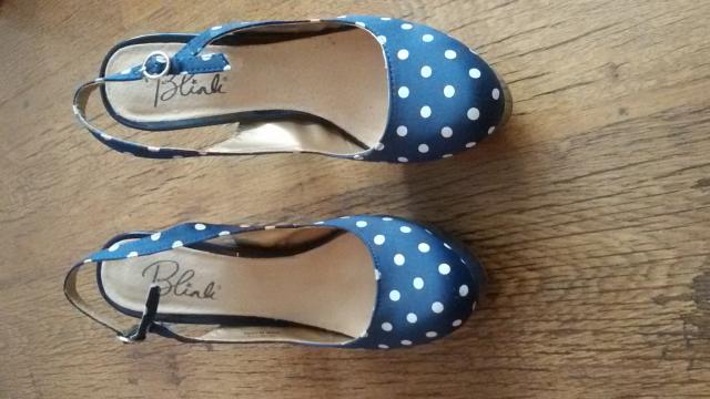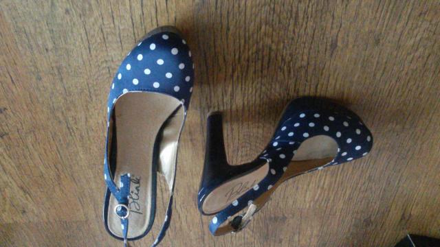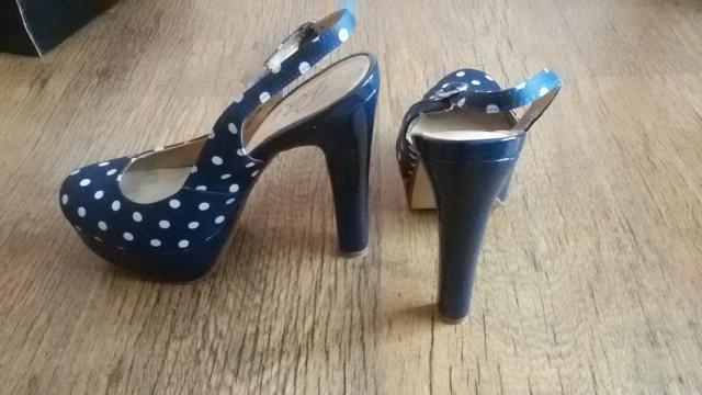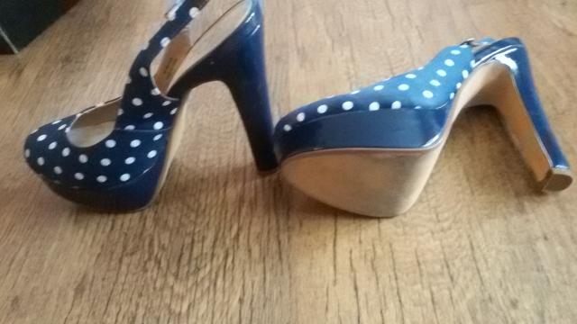 Aukštakulniai su platforma, tamsiai mėlyni su baltais taškeliais. Vieną kartą dėvėti.