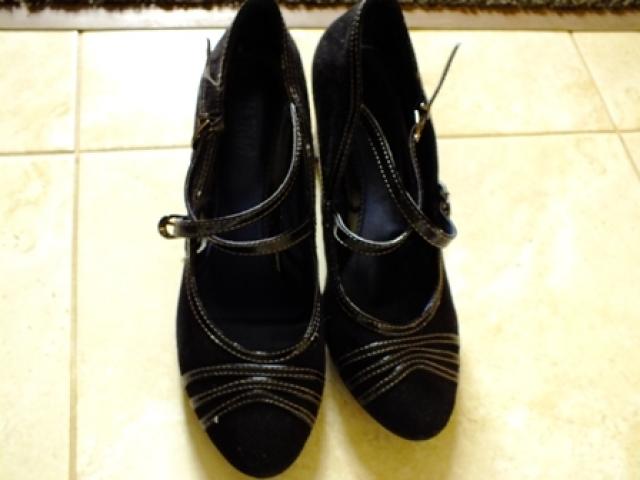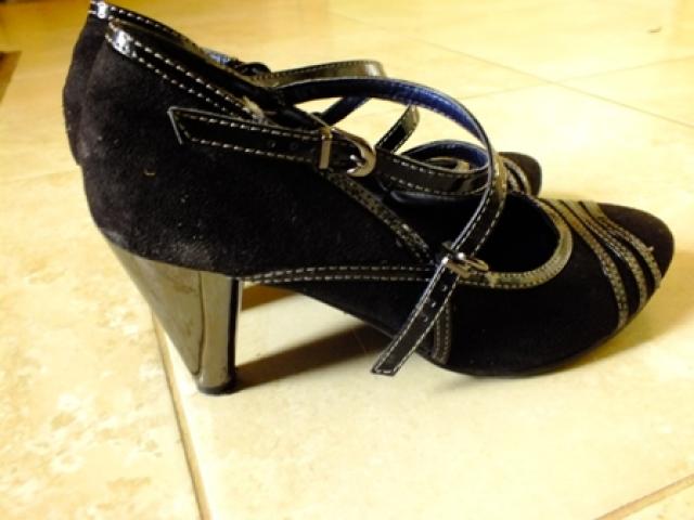 Nešioti juodi aukštakulniai su dirželiais.