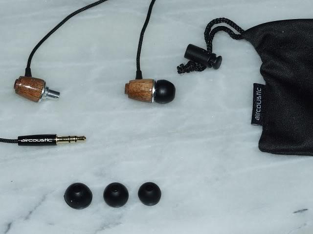 Ausinės Aircoustic Cherry Wood. Net neišpakuotos iš dėžutės. Į kompletą įeina ausinės, 2 poros pakaitinių ausinių antgalių ir medžiaginis maišelis viską susidėti.