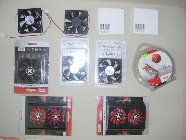 80x15mm Xilence (2vnt), 80x25mm Zalman, Xilence (4vnt.), 80x20 Sunon (1vnt.) Aušintuvai - 5 litai vnt. (visi 30Litu.) Dulkiu filtrai aušintuvams 80mm (4vnt.) 120mm (4vnt.) ir grotelės 80mm (2vnt.) - 2,5 Lito vnt. (visi 20 Litu) HDD aušintuvai Xilence (2vnt.) - 10 Litu vnt. (abu 20 Litu) IDE-SATA konverteris - 10 Litu