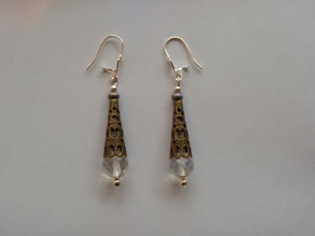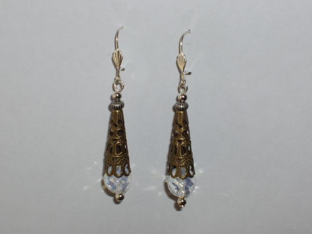 Ažūriniai auskariukai su briaunotu skaidriu opalito karoliuku (10 mm), kuris prieš šviesą turi melsvo - švelniai violetinio atspalvio. Užsegimas pasidabruotas, tvirtas (neatsisegantis savaime). Auskarų ilgis 5,5 cm