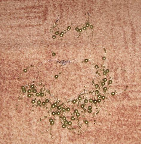 Rankų darbo samaniai auskarai ir kaklo papuošalas.
