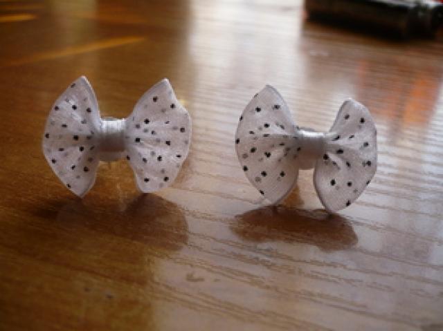 auskariukai 'kaspinėliai' prie ausies. balti, su juodais taškučiais. dydis, kaip matote nuotraukoje :) 4 LT