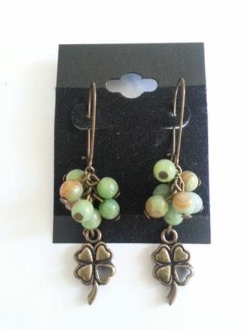 Rankų darbo auskarai. Ilgis: ~6 cm. Sudėtis - žalvario pakabukas "Dobilas" ir detalės, žalios sp. stiklo karoliukai.