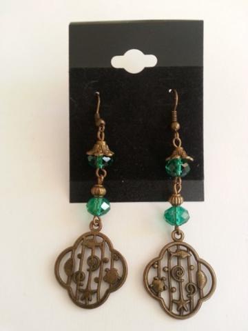 Rankų darbo auskarai. Ilgis: ~7 cm. Sudėtis - stiklo kristalai, žalvario pakabukas bei detalės