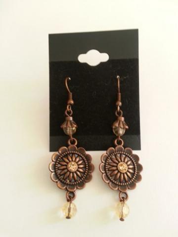 Rankų darbo auskarai. Ilgis: ~6,5 cm. Sudėtis - pakabukas "Gėlė", apvalūs akriliniai karoliukai, vario kepurėlės ir detalės